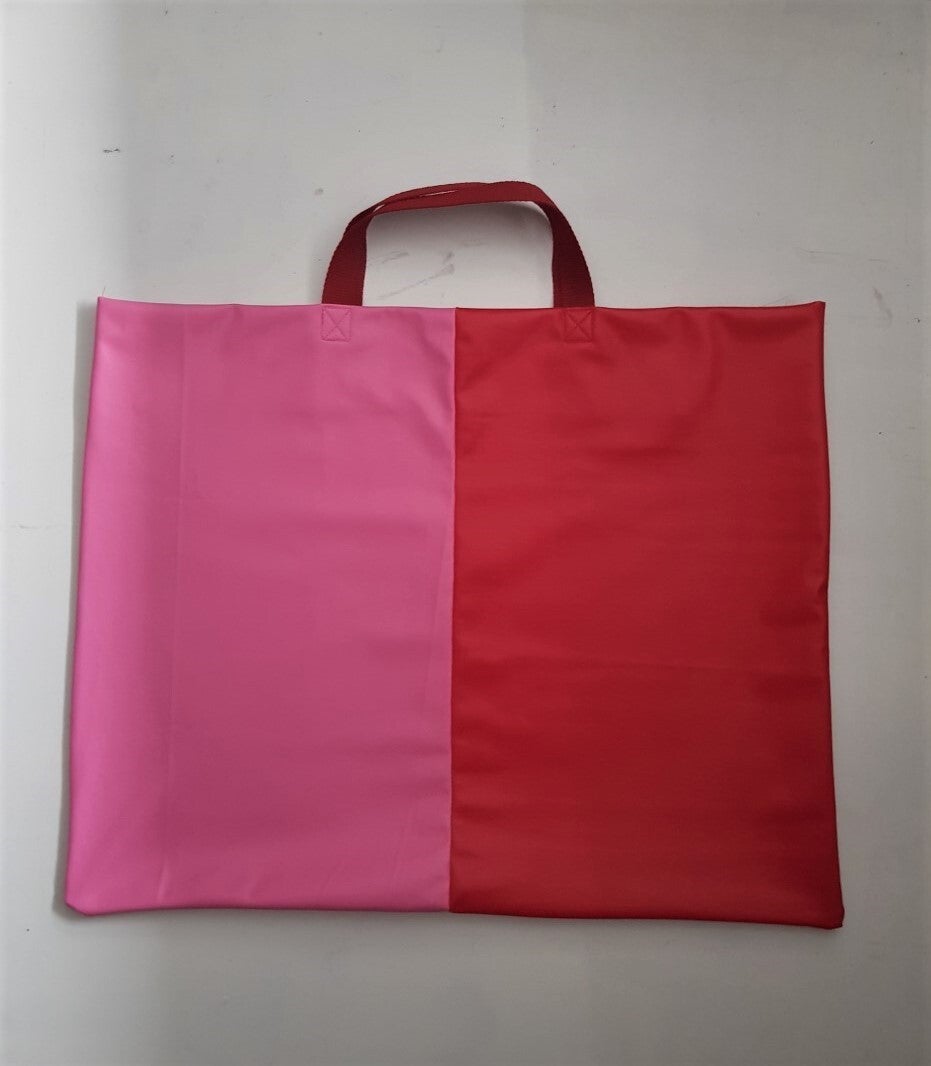 Boodschappentas van soepel en toch sterk faux leer. De 3 kleuren van de ene kant zijn aan de andere kant gespiegeld. Zo ontworpen dat je er niet tegenaan trapt bij het fietsen. Je kunt de tas klein opvouwen en zo makkelijk meenemen. Handig dus en natuurlijk: très chic!